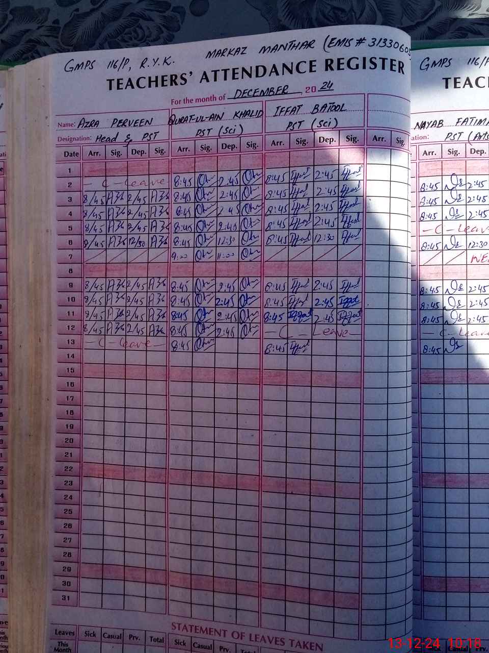 | Leave | Duty | Absent | Maternity | Medical | Ex- Pak |