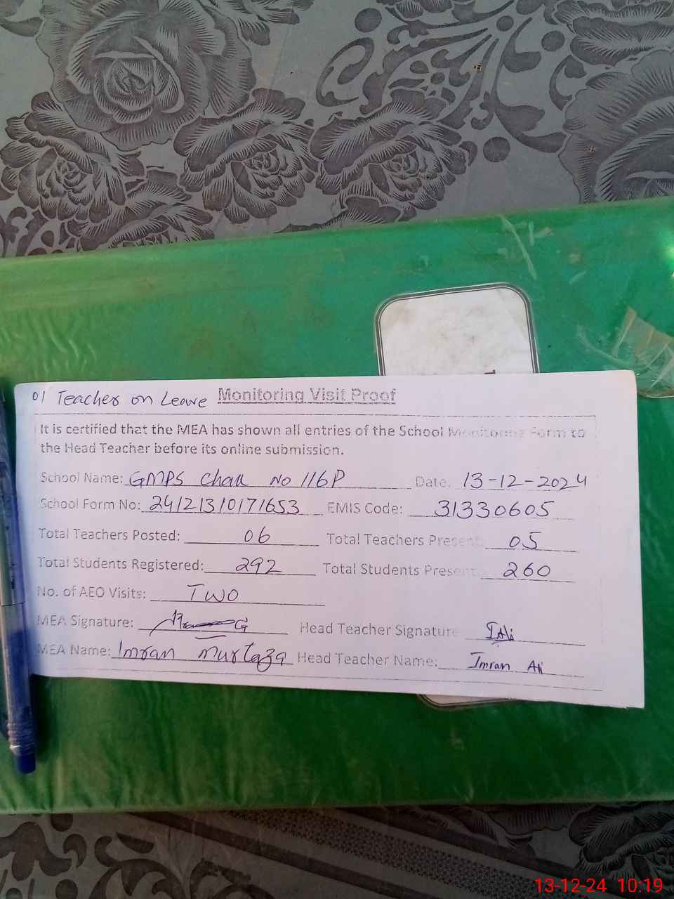 | Attendance Register | Head Teacher | MEA with School | Visit Proof |