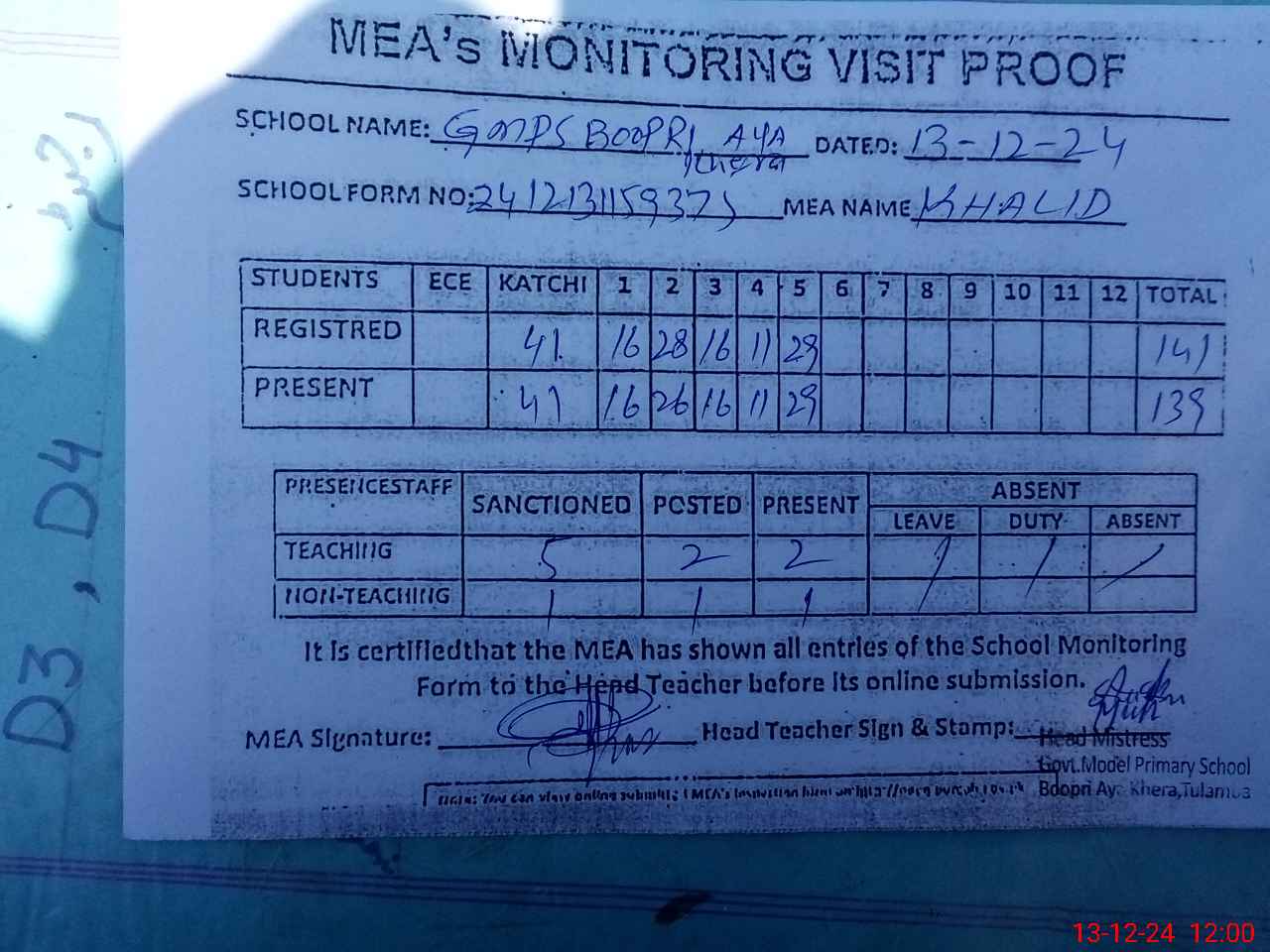 | EMIS Code: 36430400 | Name of School: GMPS BOOPRI AYA KHERA, TULAMBA | |||