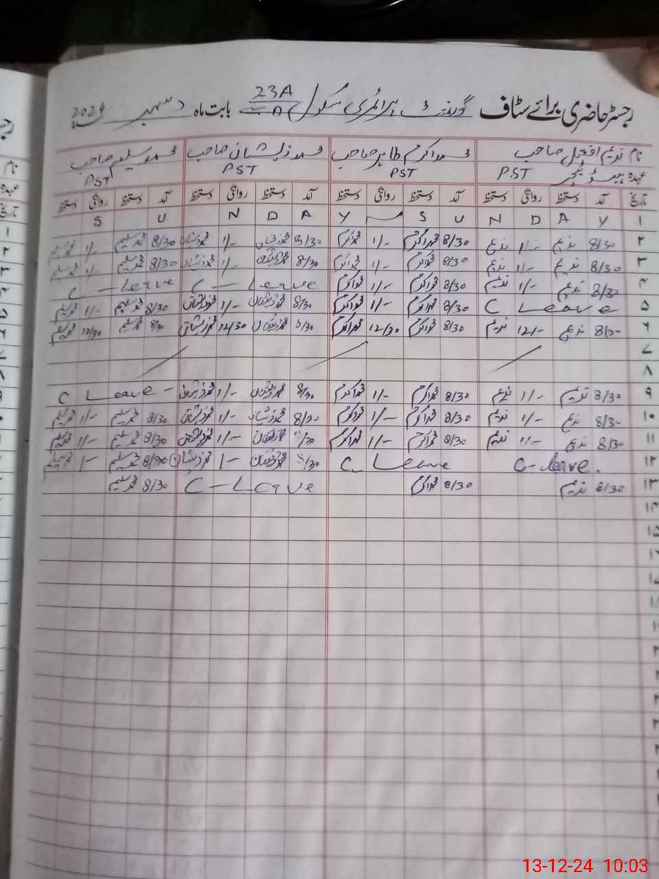 | CNIC | Full Name | Designation | R/C | Absence During Last Calender Month |