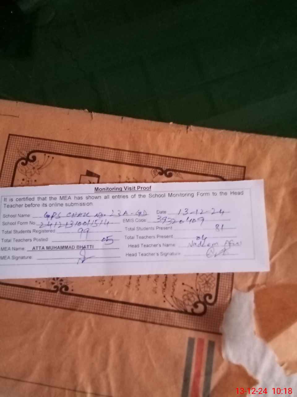 | EMIS Code: 39320409 | Name of School: GPS CHAK NO. 23-A/G.D | |||