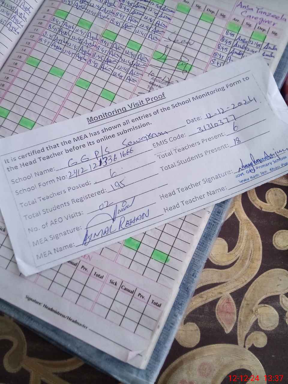 | Attendance Register | Head Teacher | MEA with School | Visit Proof |