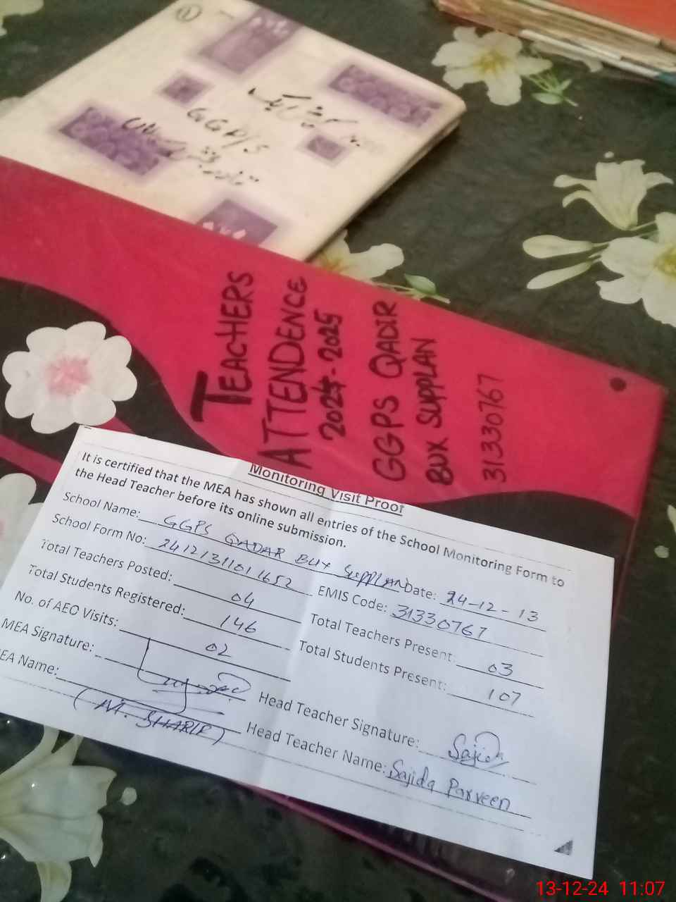 | EMIS Code: 31330767 | Name of School: GGPS QADAR BUX SUPPLAN | |||