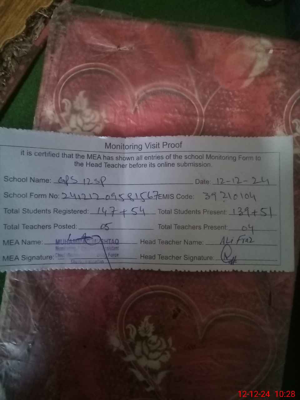| Attendance Register | Head Teacher | MEA with School | Visit Proof |