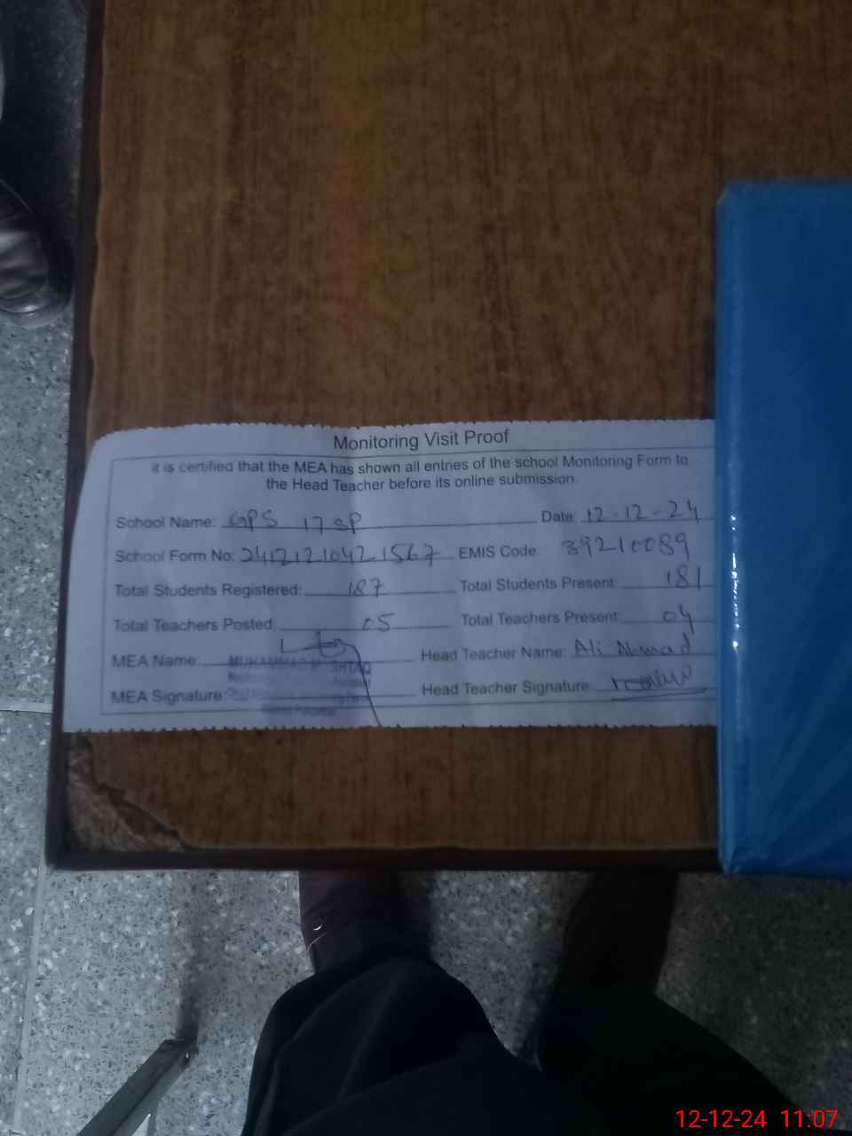 | Attendance Register | Head Teacher | MEA with School | Visit Proof |