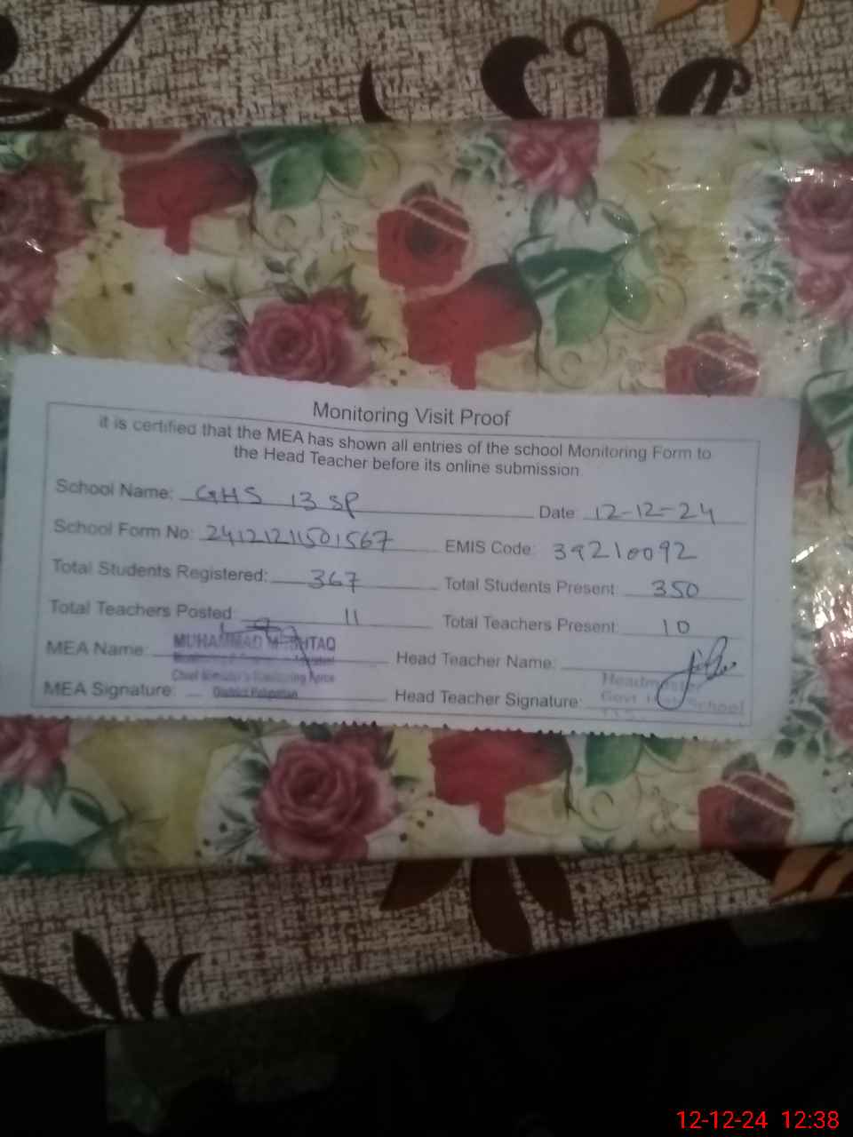 | Certified that this School was Inspected by the Undersigned MEA/DMO Today and the Information Stated Above is as Per Record. | |||||