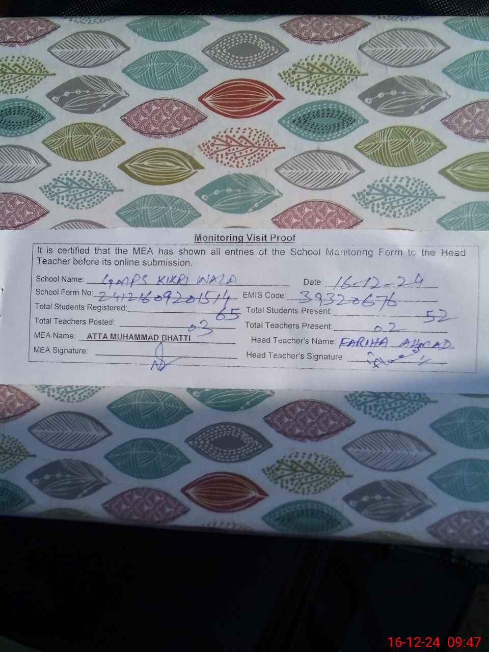 | EMIS Code: 39320676 | Name of School: GMPS KIKRI WALA | |||
