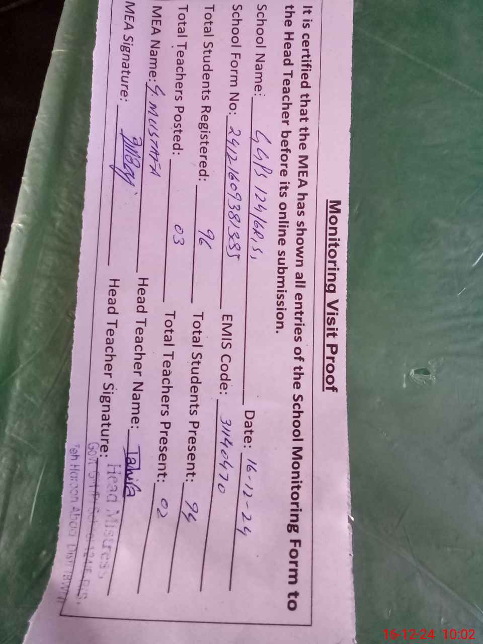 | EMIS Code: 31140470 | Name of School: GGPS CHAK NO.124/6-R | |||