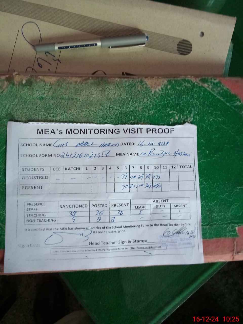 | Attendance Register | Head Teacher | MEA with School | Visit Proof |