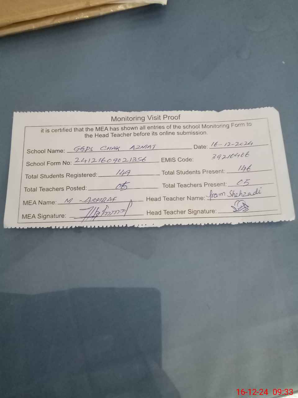 | Attendance Register | Head Teacher | MEA with School | Visit Proof |