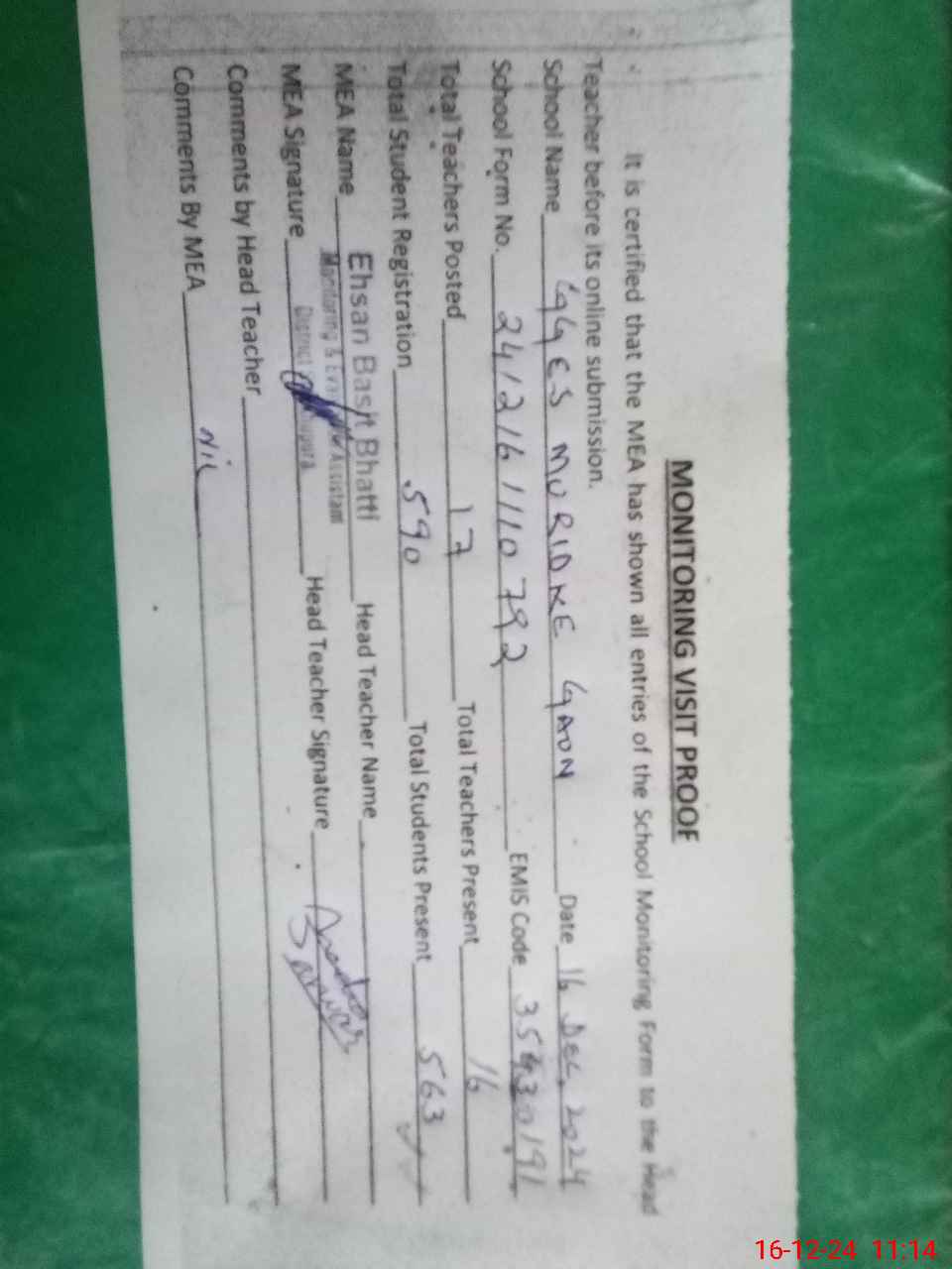 | Certified that this School was Inspected by the Undersigned MEA/DMO Today and the Information Stated Above is as Per Record. | |||||