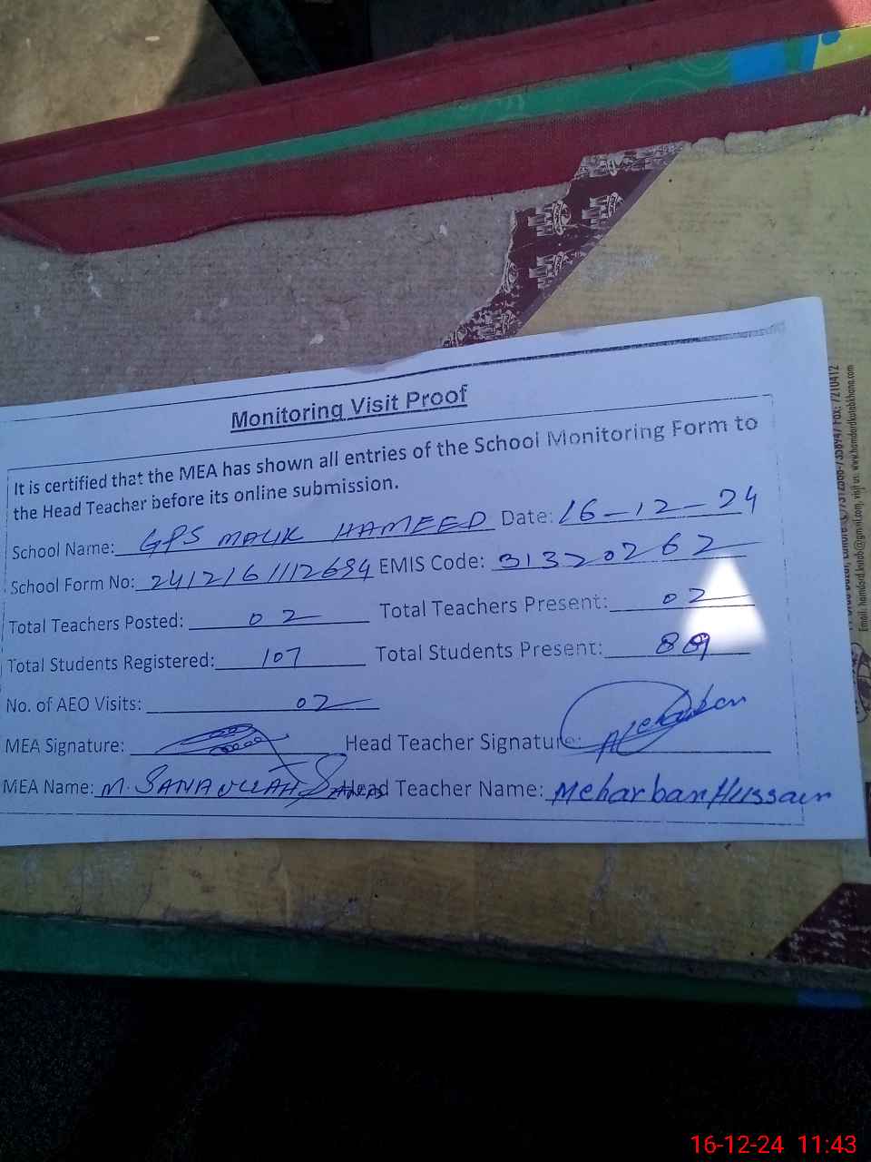 | Attendance Register | Head Teacher | MEA with School | Visit Proof |