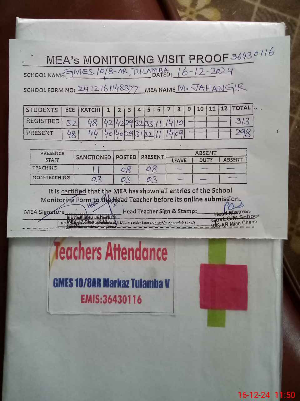 | Attendance Register | Head Teacher | MEA with School | Visit Proof |