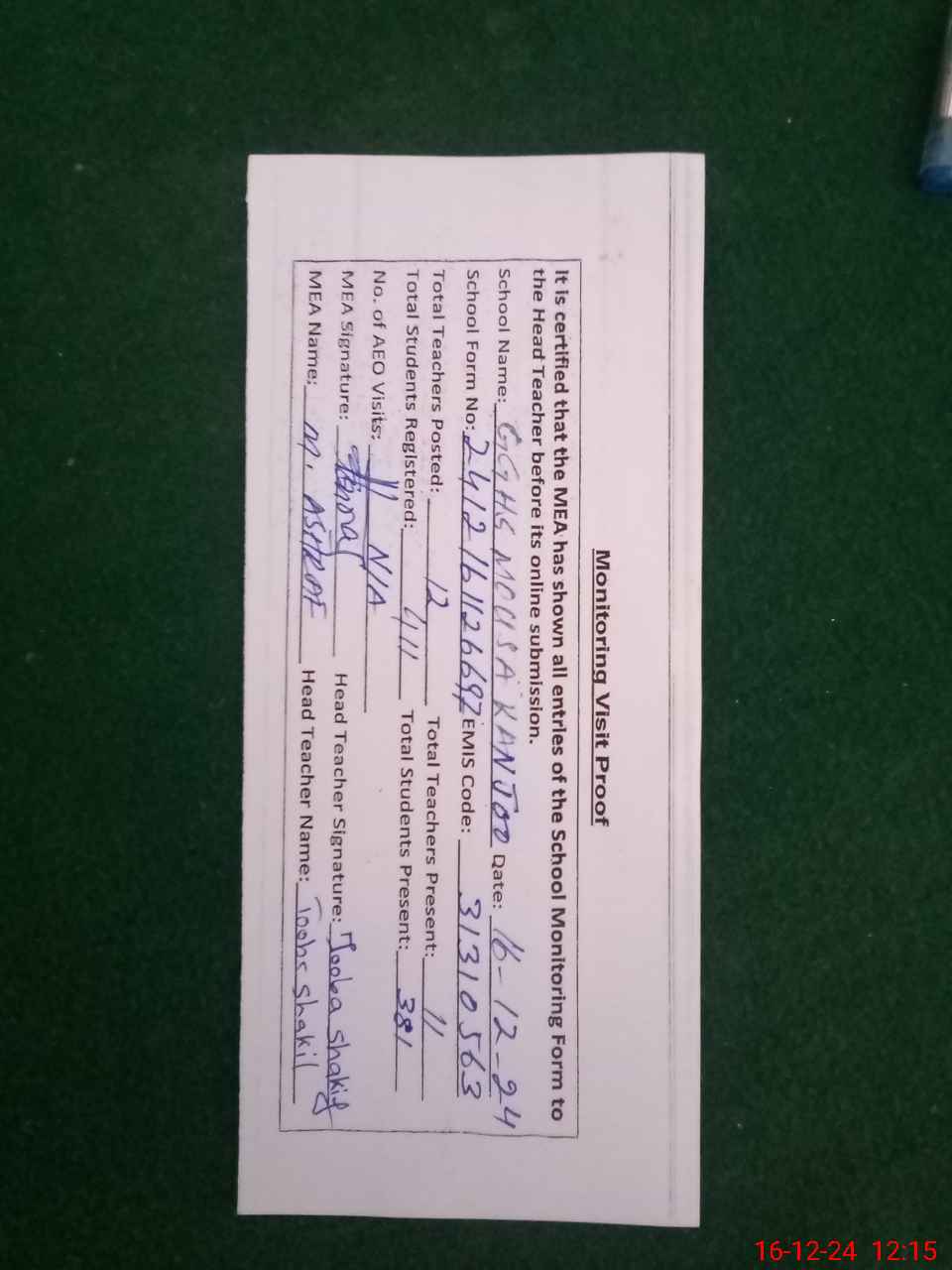 | Attendance Register | Head Teacher | MEA with School | Visit Proof |