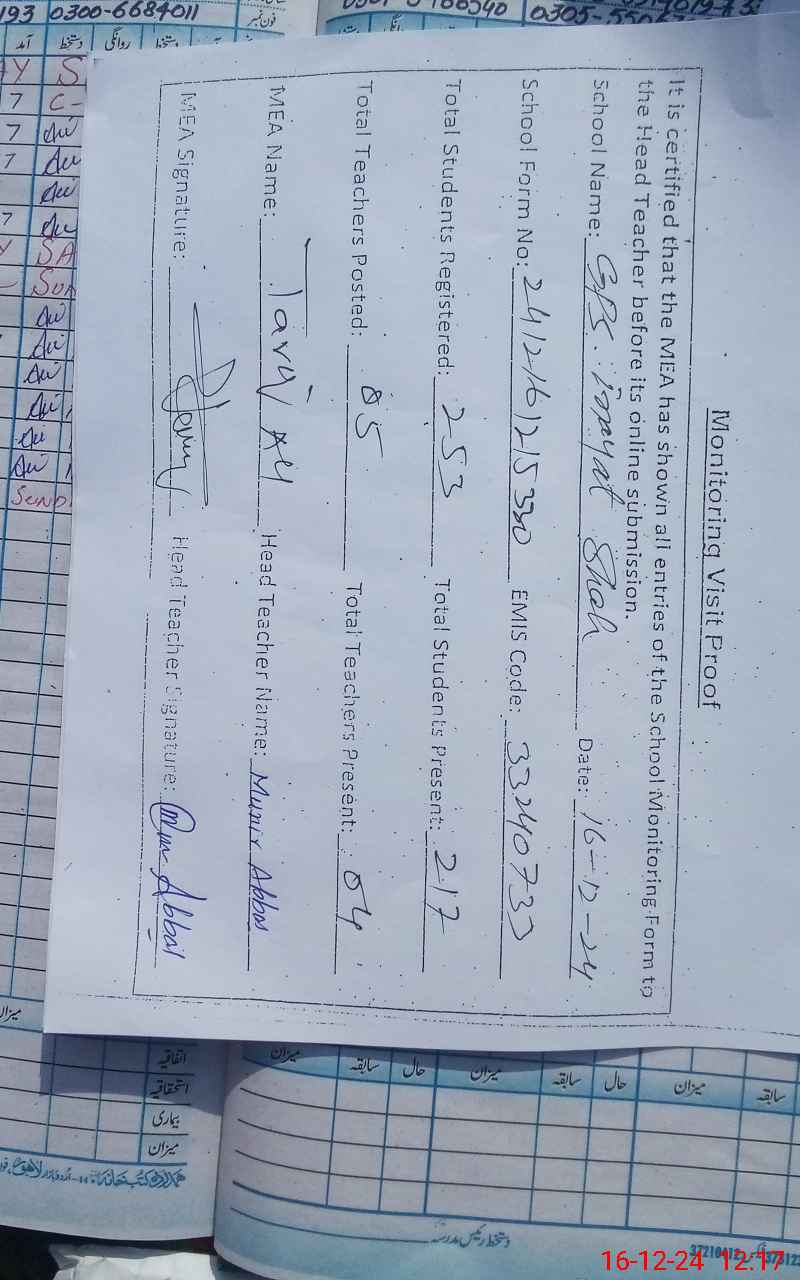 | EMIS Code: 33240733 | Name of School: GPS INAYAT SHAH | |||