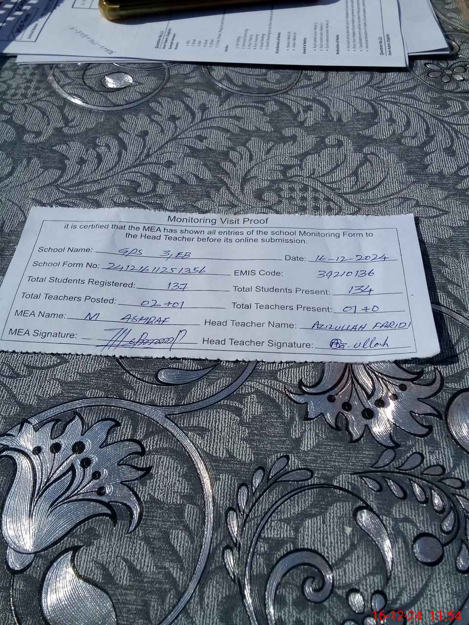 | Attendance Register | Head Teacher | MEA with School | Visit Proof |