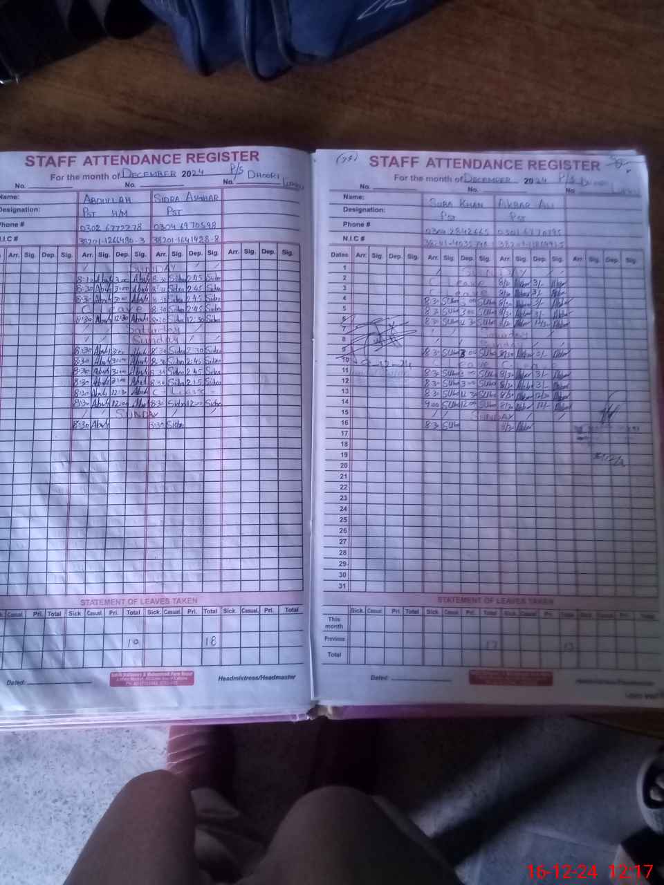 | CNIC | Full Name | Designation | R/C | Absence during last cal. month |