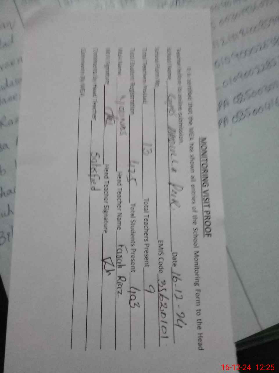 | Certified that this School was Inspected by the Undersigned MEA/DMO Today and the Information Stated Above is as Per Record. | |||||