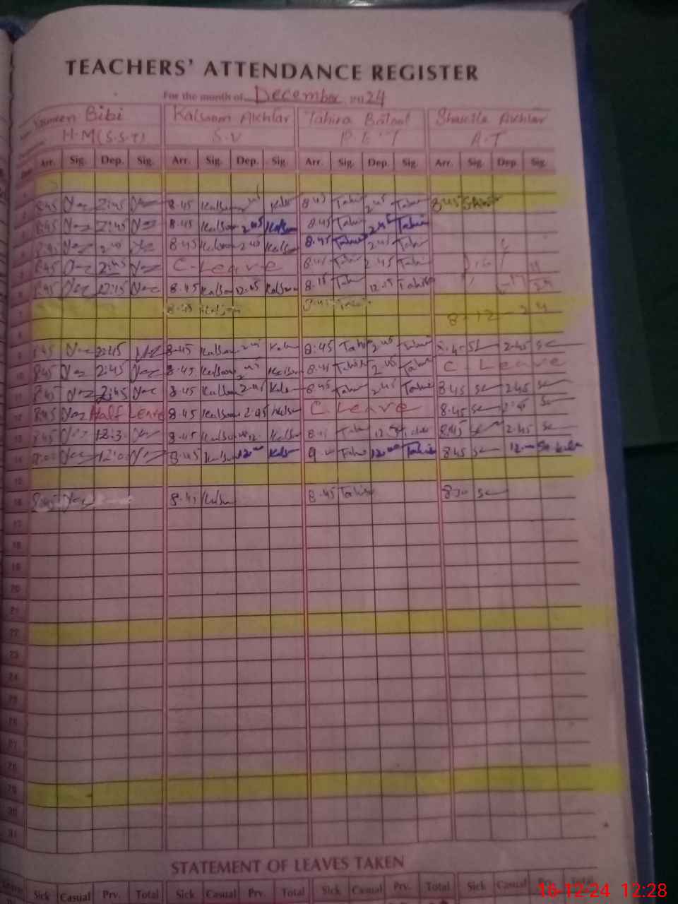 | CNIC | Full Name | Designation | R/C | Absence During Last Calender Month |