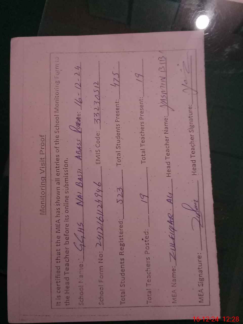 | Certified that this School was Inspected by the Undersigned MEA/DMO Today and the Information Stated Above is as Per Record. | |||||