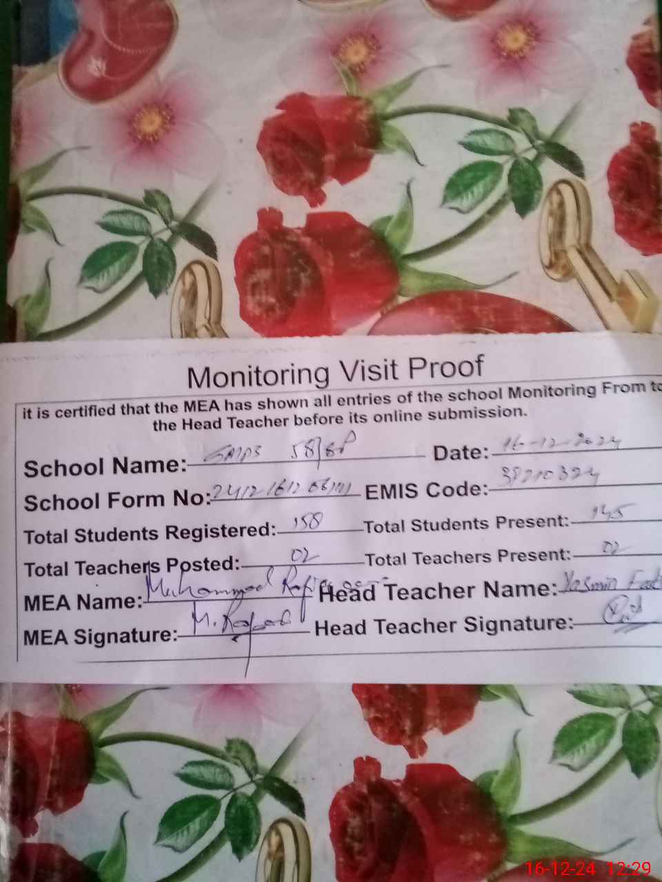 | Attendance Register | Head Teacher | MEA with School | Visit Proof |