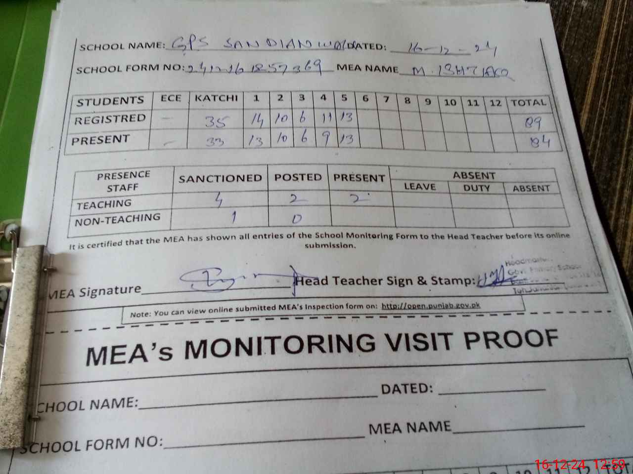 | Attendance Register | Head Teacher | MEA with School | Visit Proof |