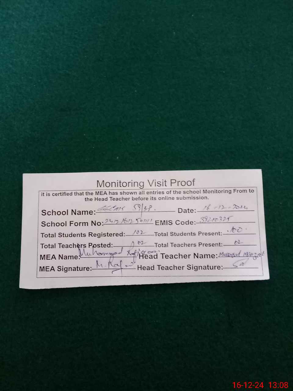 | Attendance Register | Head Teacher | MEA with School | Visit Proof |