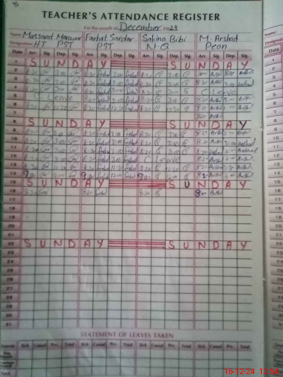 | CNIC | Full Name | Designation | R/C | Absence During Last Calender Month |