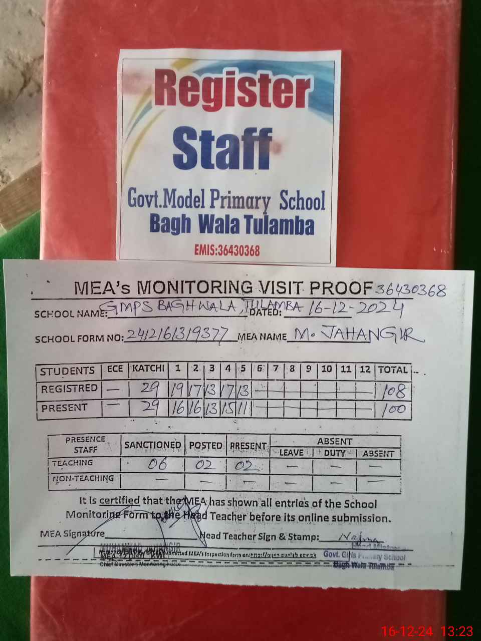 | Attendance Register | Head Teacher | MEA with School | Visit Proof |