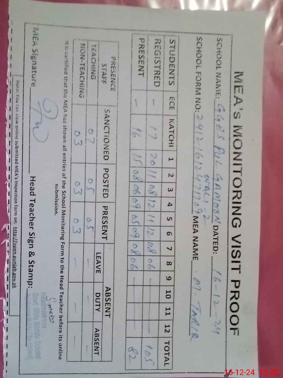 | Certified that this School was Inspected by the Undersigned MEA/DMO Today and the Information Stated Above is as Per Record. | |||||