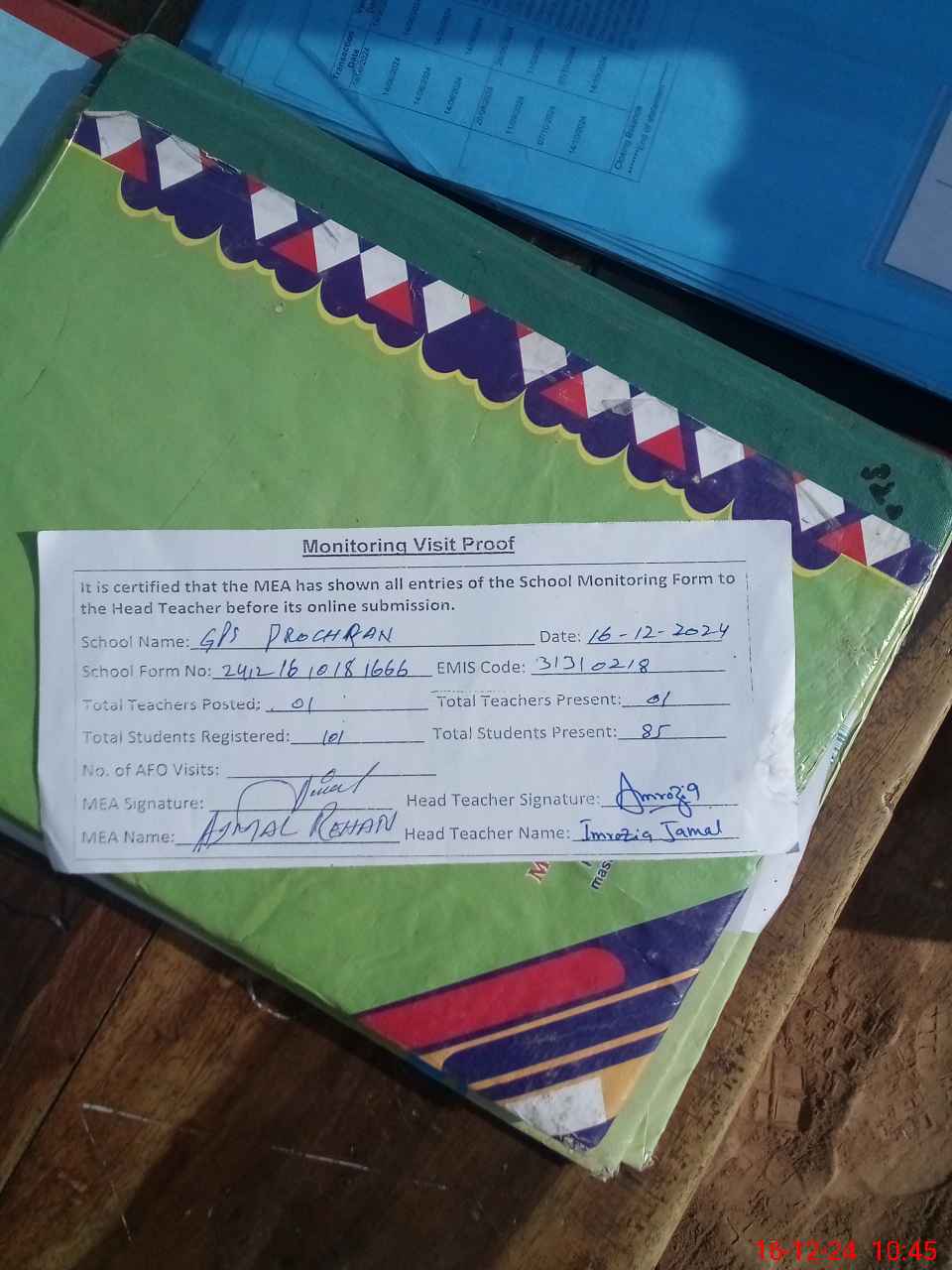 | EMIS Code: 31310218 | Name of School: GPS PROCHRAN (After Noon) | |||