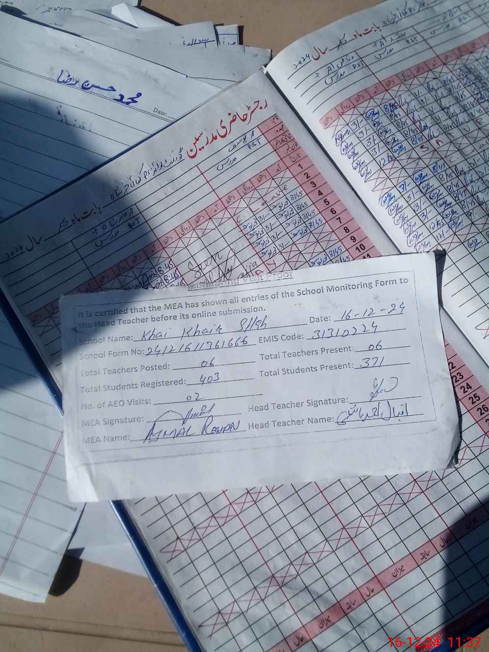 | Attendance Register | Head Teacher | MEA with School | Visit Proof |