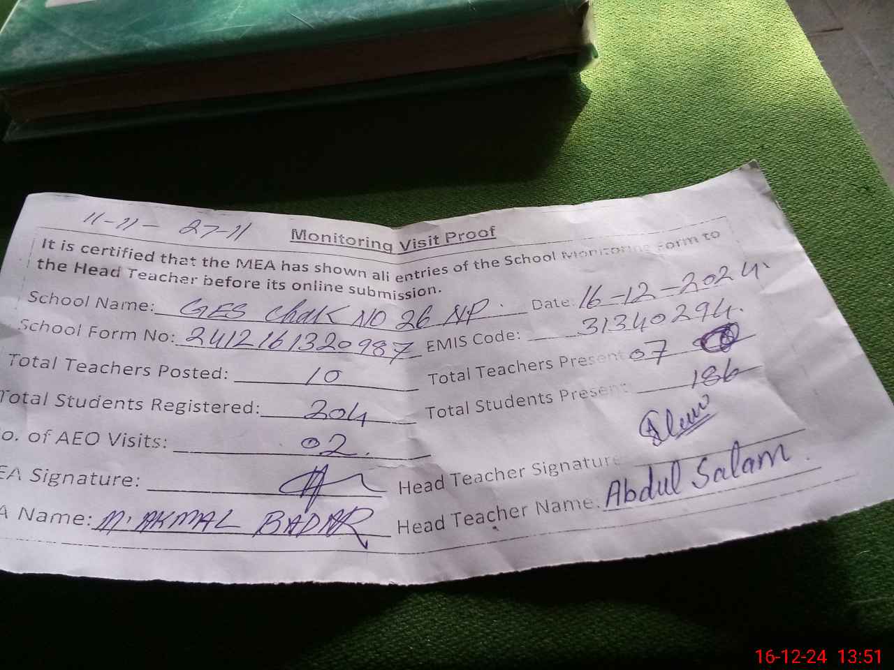 | Attendance Register | Head Teacher | MEA with School | Visit Proof |