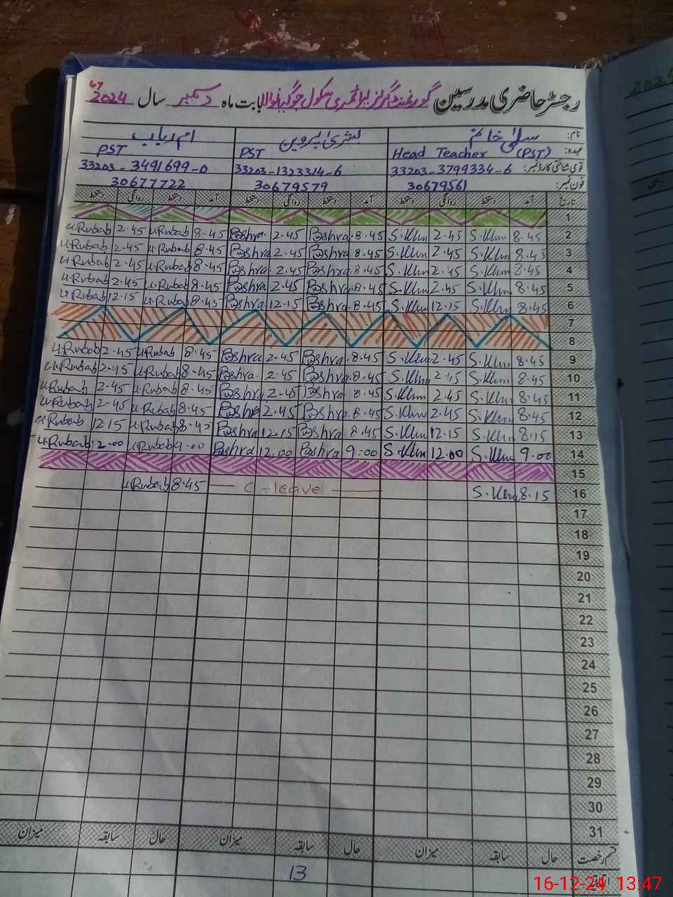 | CNIC | Full Name | Designation | R/C | Absence During Last Calender Month |
