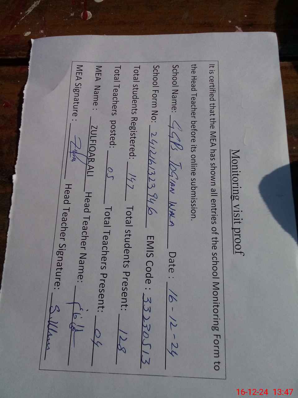 | Attendance Register | Head Teacher | MEA with School | Visit Proof |
