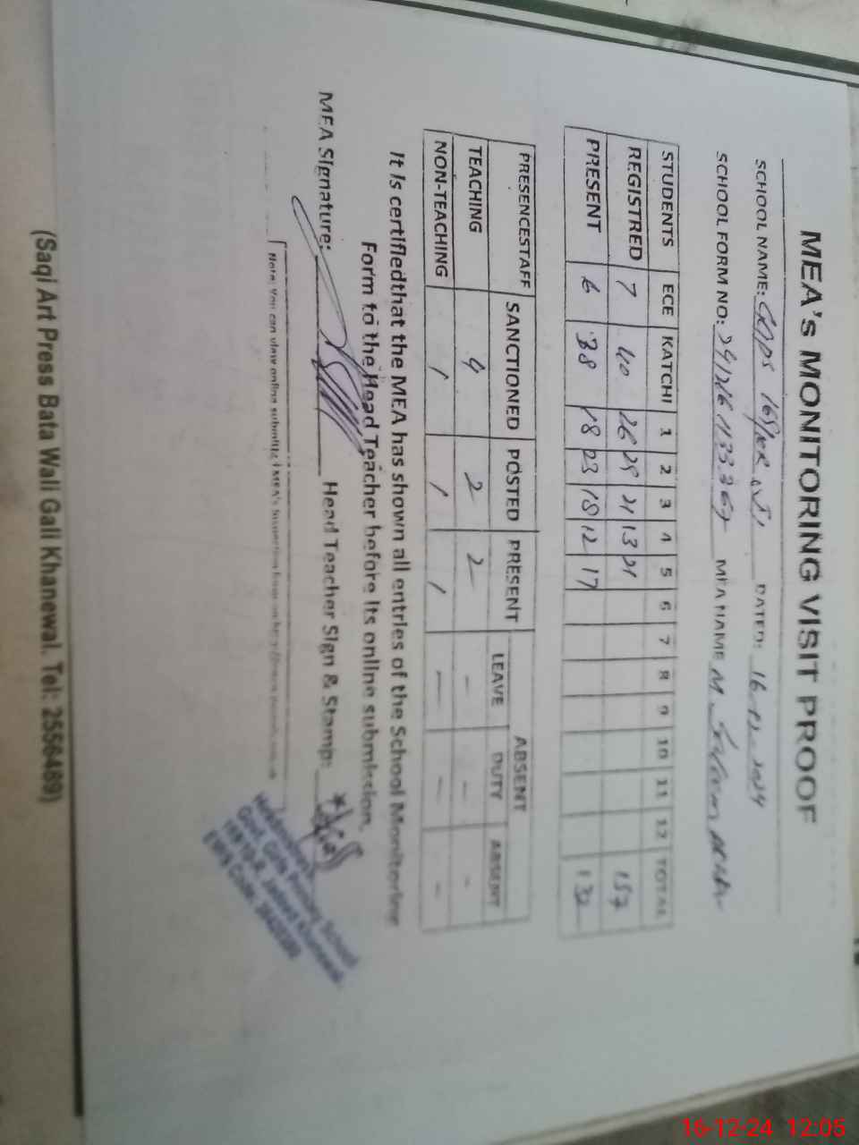 | Attendance Register | Head Teacher | MEA with School | Visit Proof |