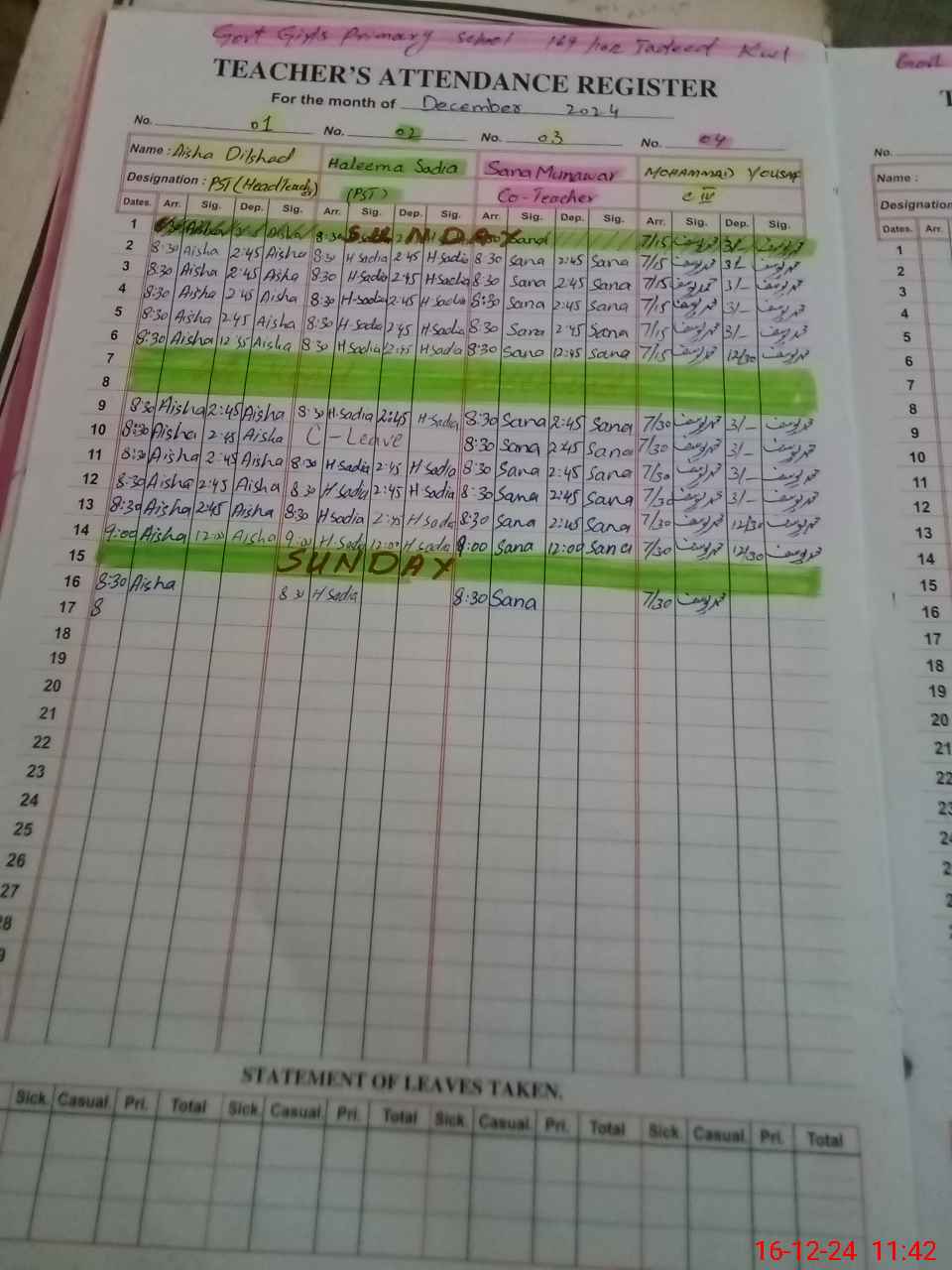 | Leave | Duty | Absent | Maternity | Medical | Ex- Pak |