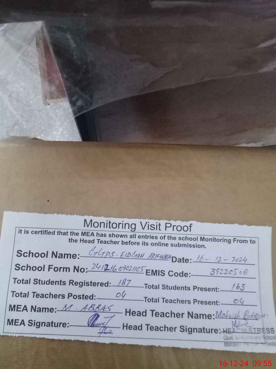 | EMIS Code: 39220508 | Name of School: GGPS EID GAH ARIFWALA | |||