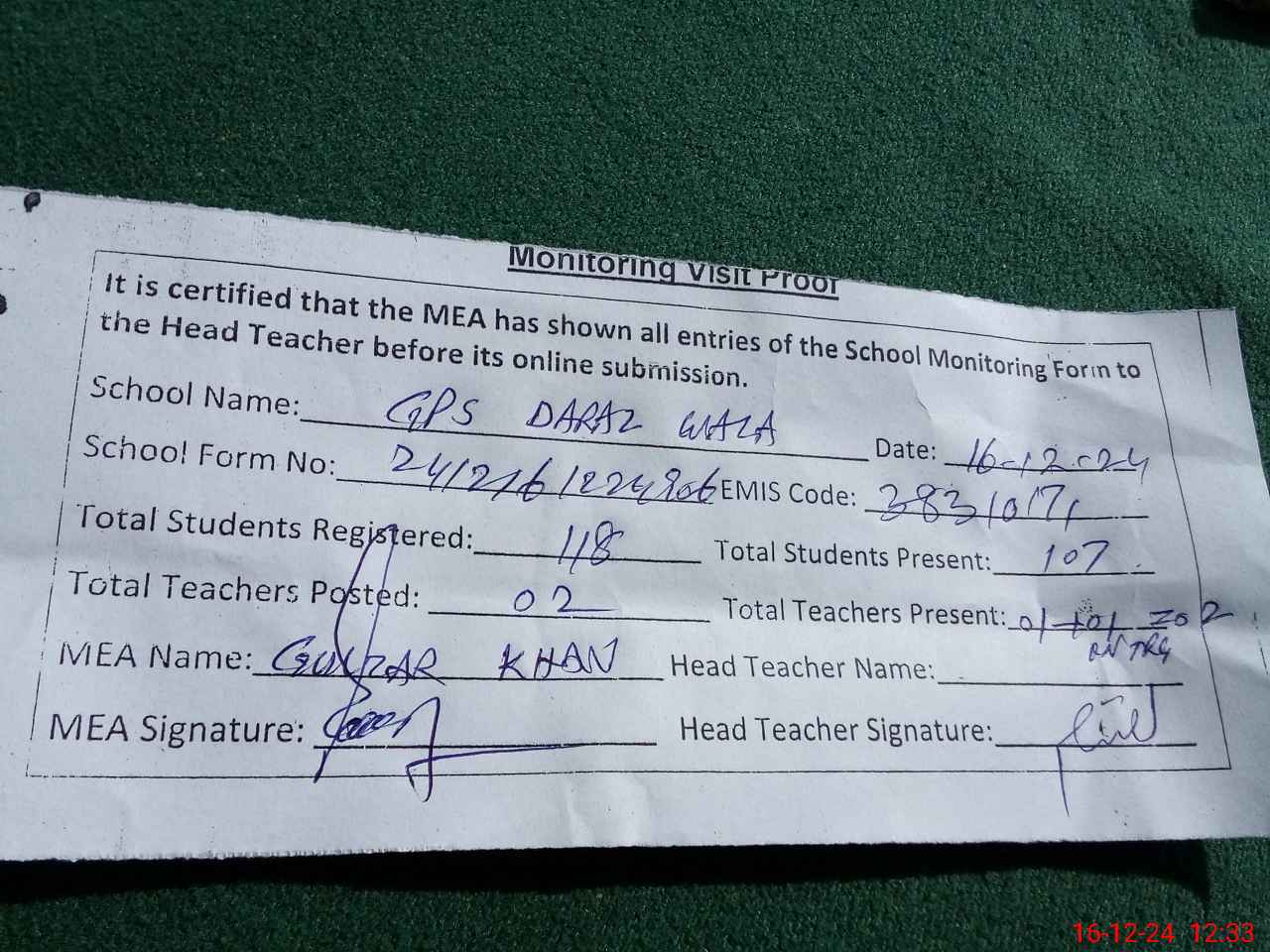 | EMIS Code: 38310171 | Name of School: GPS DARAZ WALA | |||