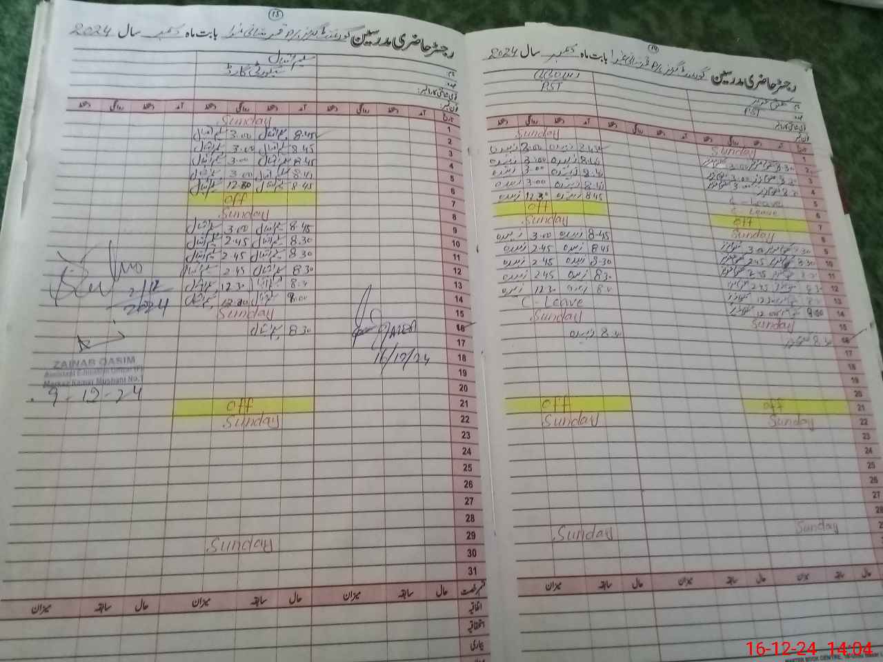 | CNIC | Full Name | Designation | R/C | Absence During Last Calender Month |
