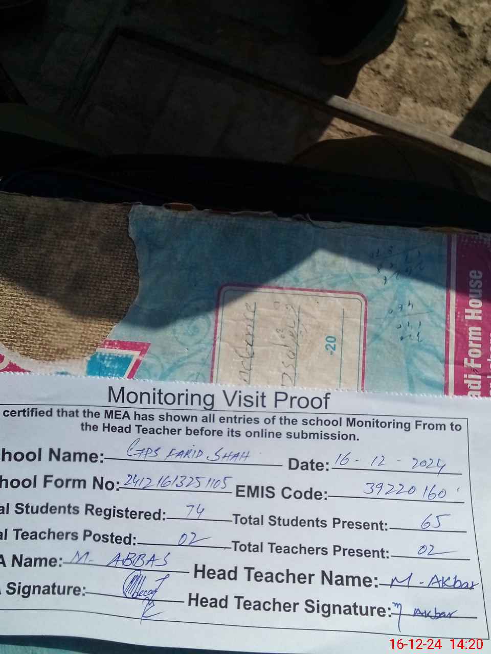 | Attendance Register | Head Teacher | MEA with School | Visit Proof |