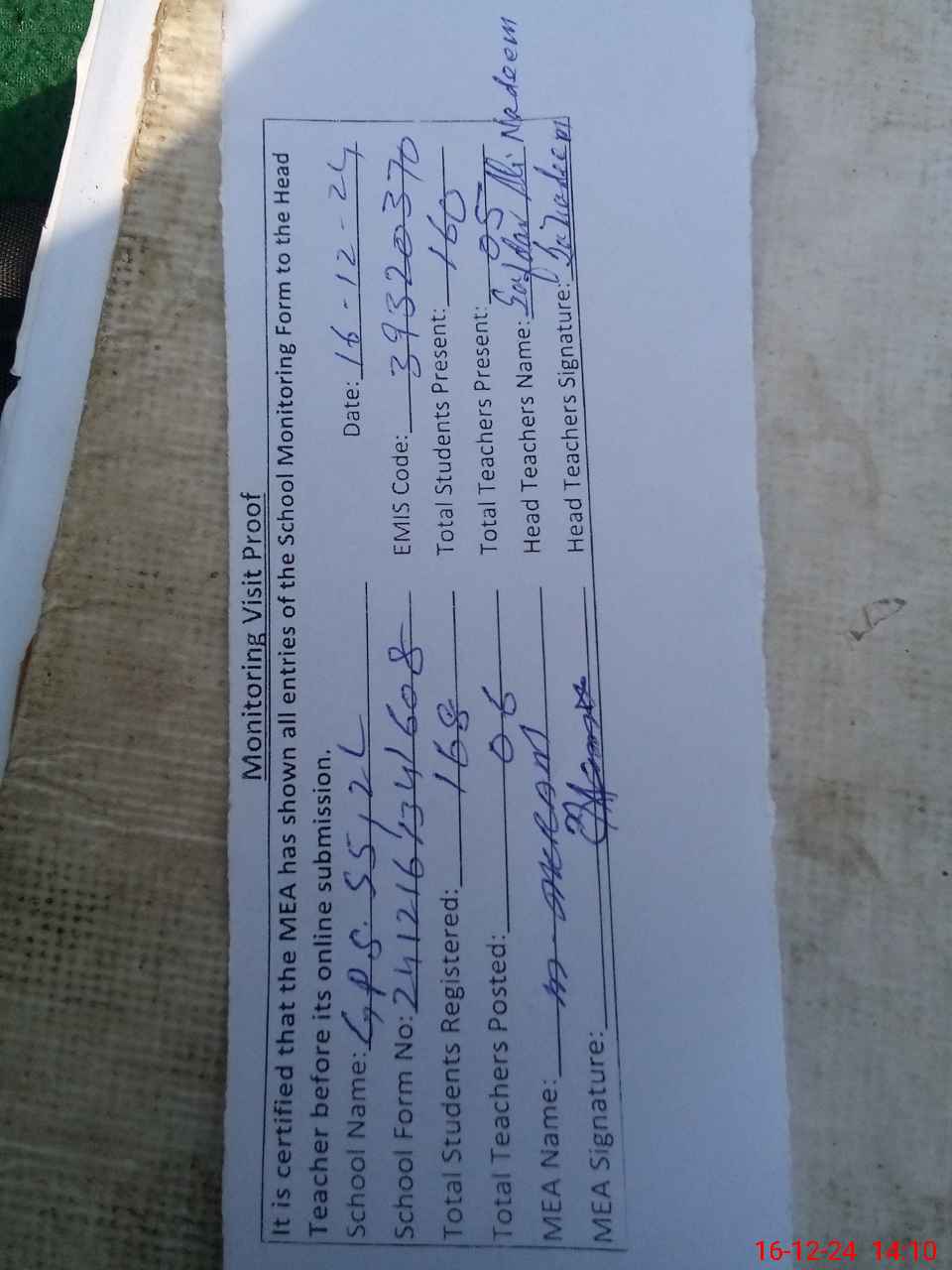 | Attendance Register | Head Teacher | MEA with School | Visit Proof |
