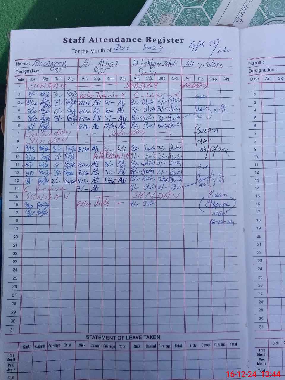 | Leave | Duty | Absent | Maternity | Medical | Ex- Pak |