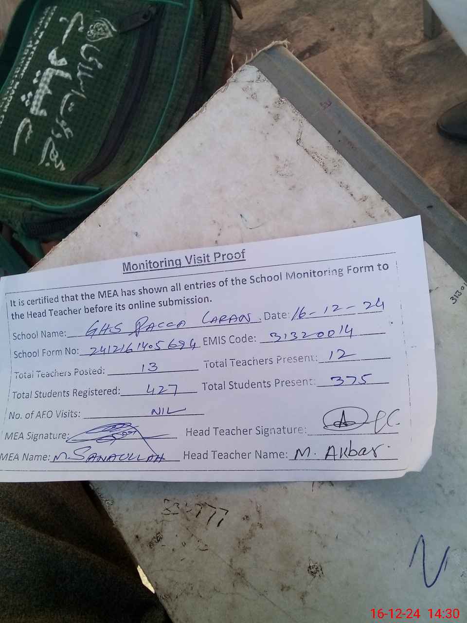 | Attendance Register | Head Teacher | MEA with School | Visit Proof |