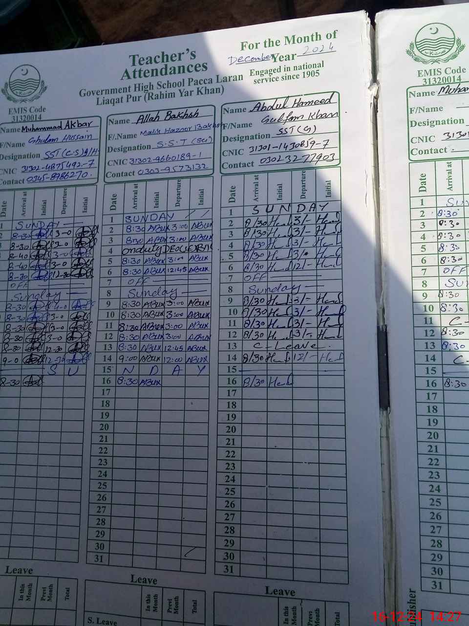 | CNIC | Full Name | Designation | R/C | Absence During Last Calender Month |