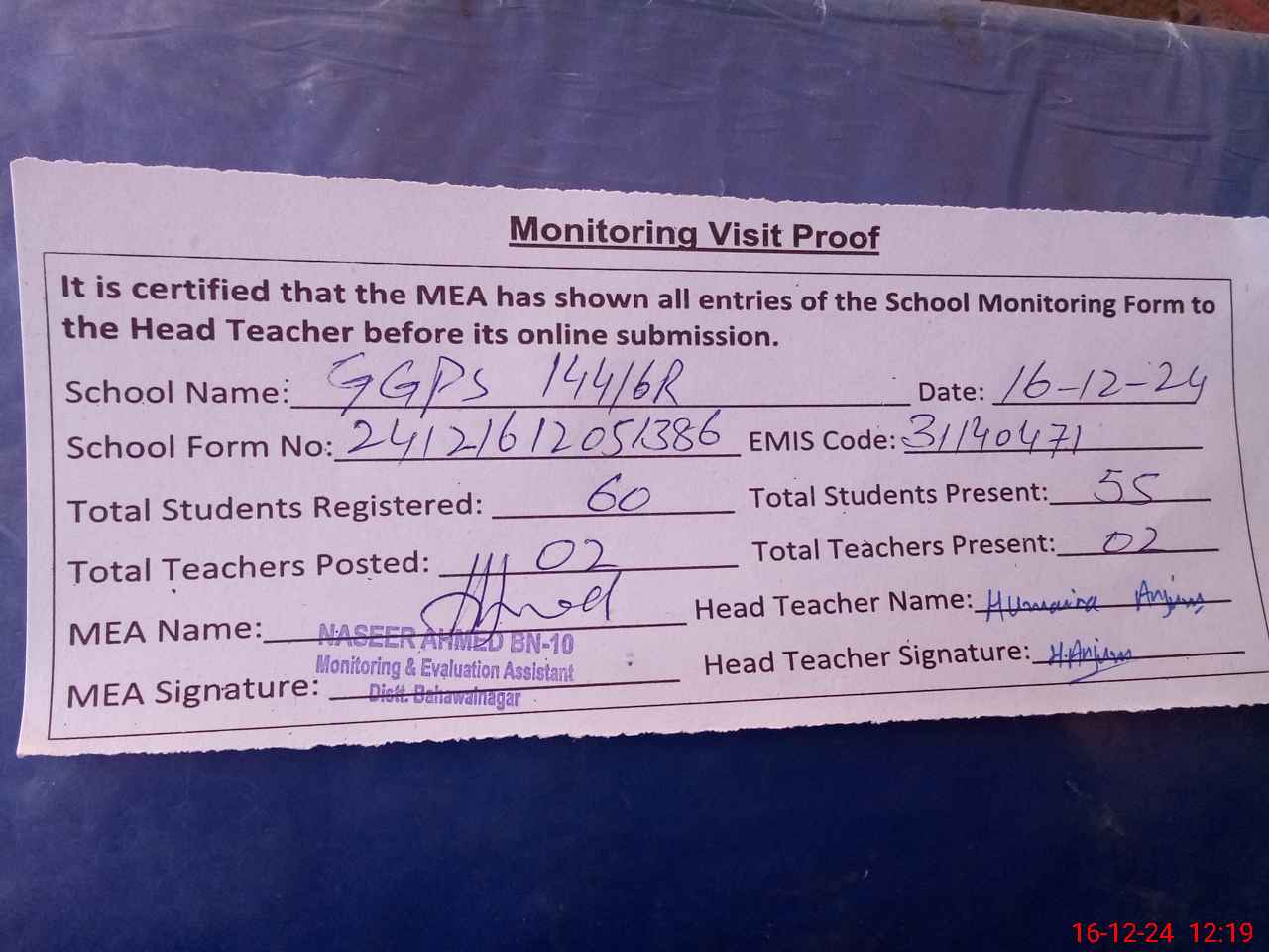 | Attendance Register | Head Teacher | MEA with School | Visit Proof |