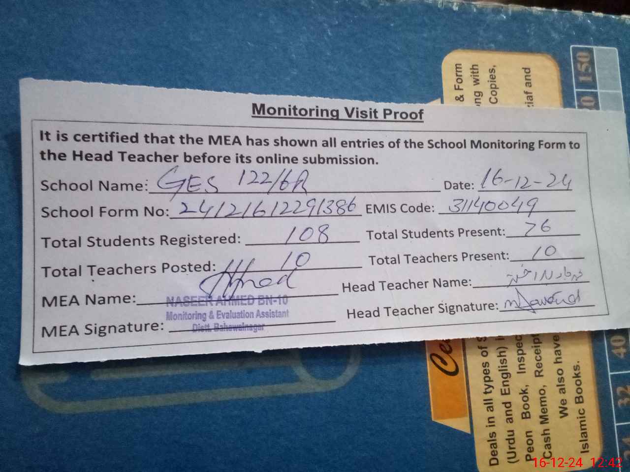 | Attendance Register | Head Teacher | MEA with School | Visit Proof |
