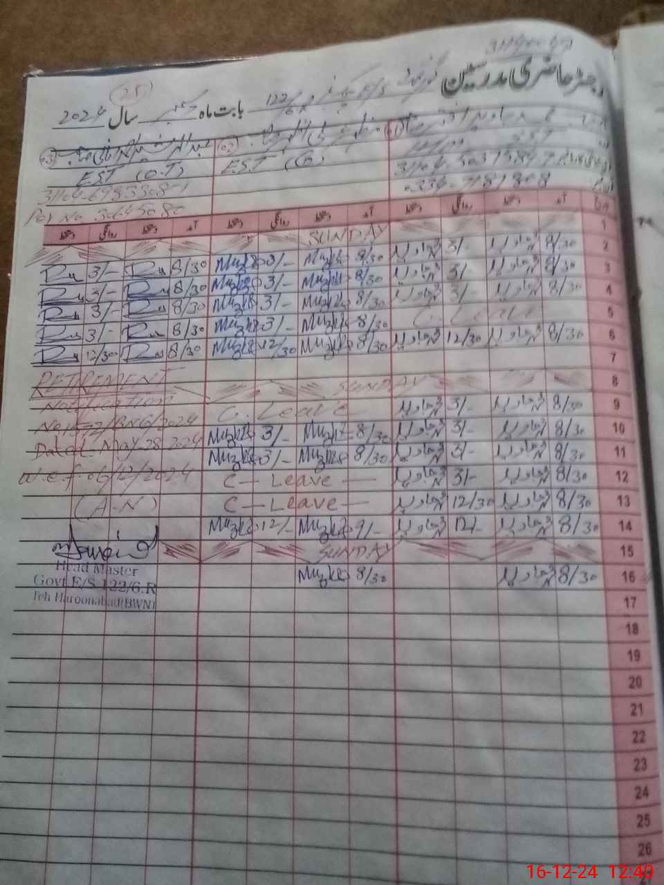 | CNIC | Full Name | Designation | R/C | Absence During Last Calender Month |