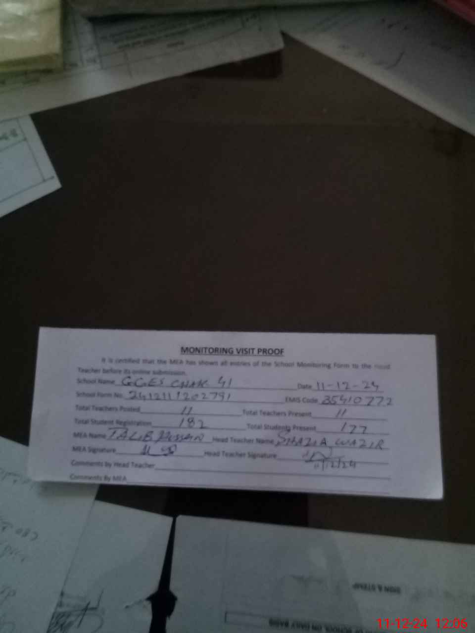 | Attendance Register | Head Teacher | MEA with School | Visit Proof |