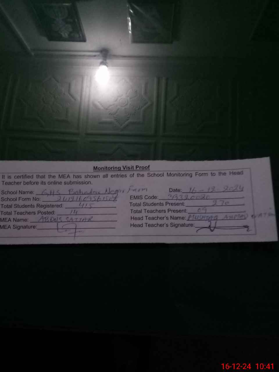 | Certified that this School was Inspected by the Undersigned MEA/DMO Today and the Information Stated Above is as Per Record. | |||||